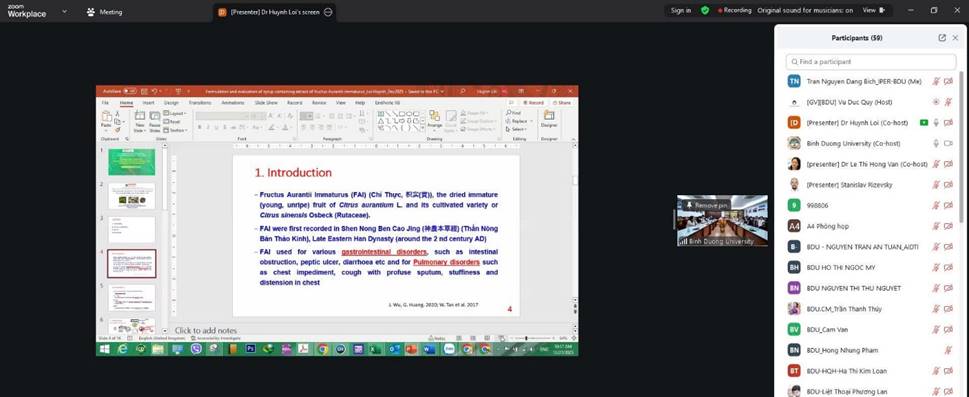 Đại diện nhóm nghiên cứu đến từ , Thạc sĩ Trần Huyền Trân đã trình bày báo cáo với chủ đề: "Investigation of Antioxidant and Antibacterial Properties of Extract Fractions from Paederia lanuginosa Wall. Leaves". Bài báo cáo tập trung vào việc khảo sát các đặc tính chống oxy hóa và kháng khuẩn từ các phân đoạn chiết xuất của lá Mơ lông, mở ra tiềm năng ứng dụng mới cho loài dược liệu quen thuộc này. (thuộc nhóm nghiên cứu Le Van Ut, Ms. Chung Long Din)