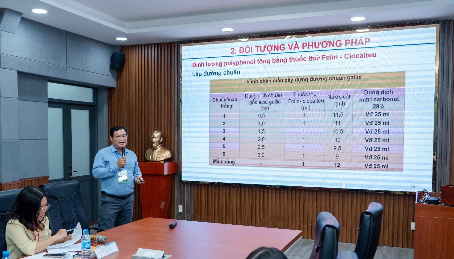 Vững vàng chuyên môn, sâu sắc thực tiễn: Bên cạnh công nghệ, các giá trị cốt lõi vẫn được vun đắp. TS. Huỳnh Lời – Trưởng Bộ môn Dược học đã mang đến góc nhìn giá trị về dược cổ truyền, góp phần bảo tồn tinh hoa y học dân tộc. Song song đó, TS. Lê Văn Út – Phó Viện trưởng đã báo cáo đề tài “Khảo sát khả năng kháng khuẩn và kháng oxy hóa Ô rô nước”, thể hiện sự nghiêm túc trong nghiên cứu thực nghiệm ứng dụng.