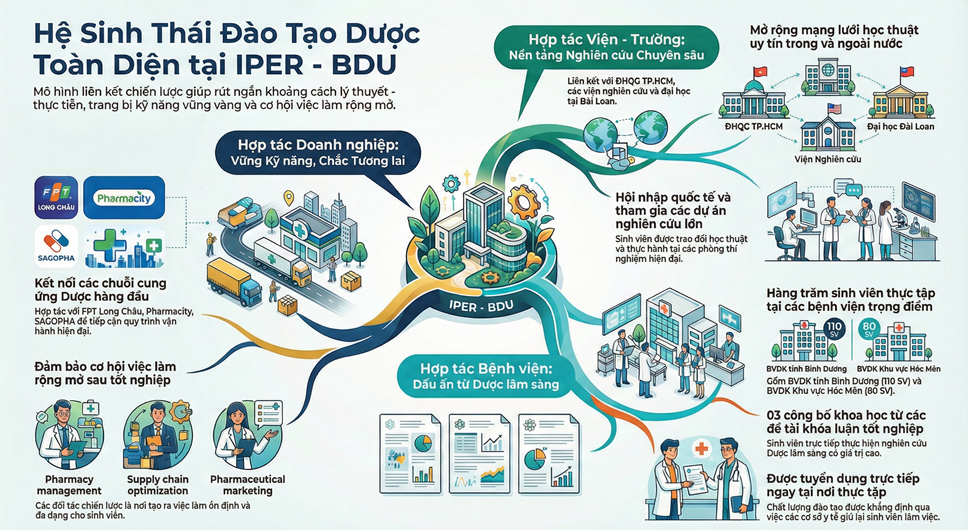 Tại IPER - BDU, sự hợp tác không chỉ là những văn bản ký kết, mà là những chuyến đi kiến tập thực tế, những giờ thực hành tại bệnh viện, những đề tài nghiên cứu được công bố và quan trọng nhất là cơ hội việc làm vững chắc cho sinh viên ngay khi ra trường.